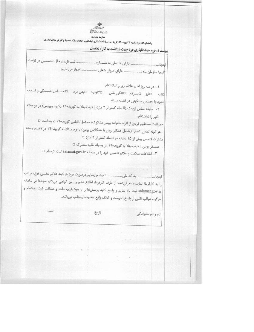 دریافت فرم خود اظهاری فرد جهت بازگشت به کار