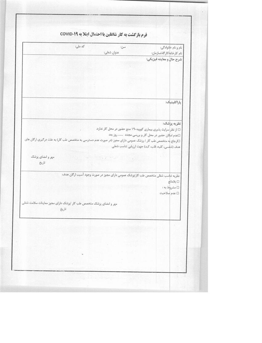 دریافت فرم بازگشت به کار شاغلین با احتمال ابتلا به COVID-19